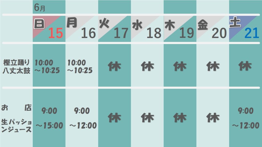 2025年5月31日 / 最終更新日時 : 2025年7月1日 8jyo88tori 営業案内 営業案内 6月(週間) 樫立踊り・八丈太鼓の予定(月間) FacebookXBlueskyHatenaCopy